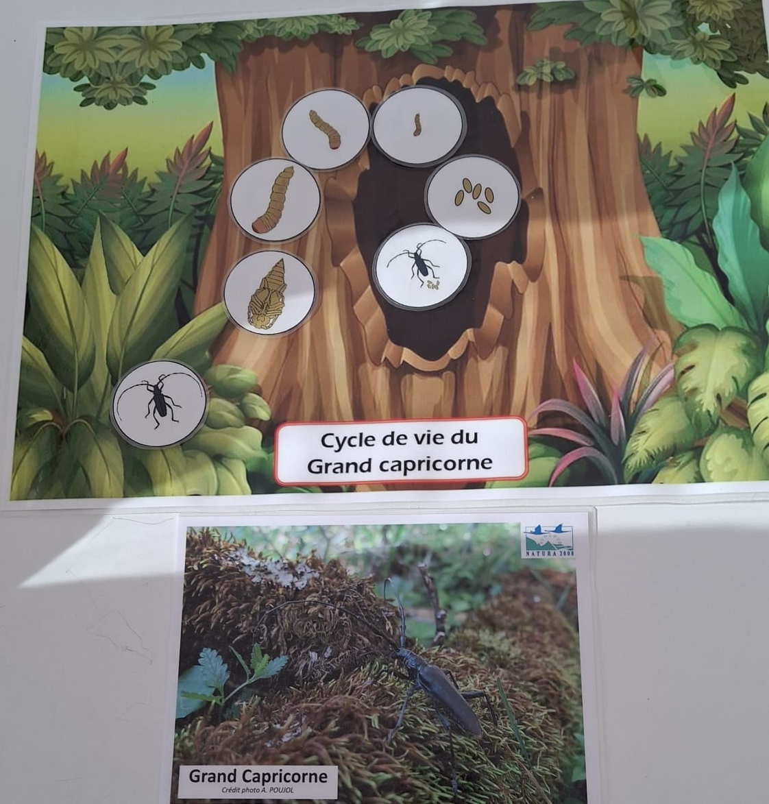 En bas : le cycle de vie du grand capricorne qui vit toute son enfance dans l’arbre en creusant des galeries et après la larve se met dans un cocon et après il y a l’étape de la métamorphose et l’adulte va aller vivre dans les feuilles pour se nourrir de la sève des plantes.