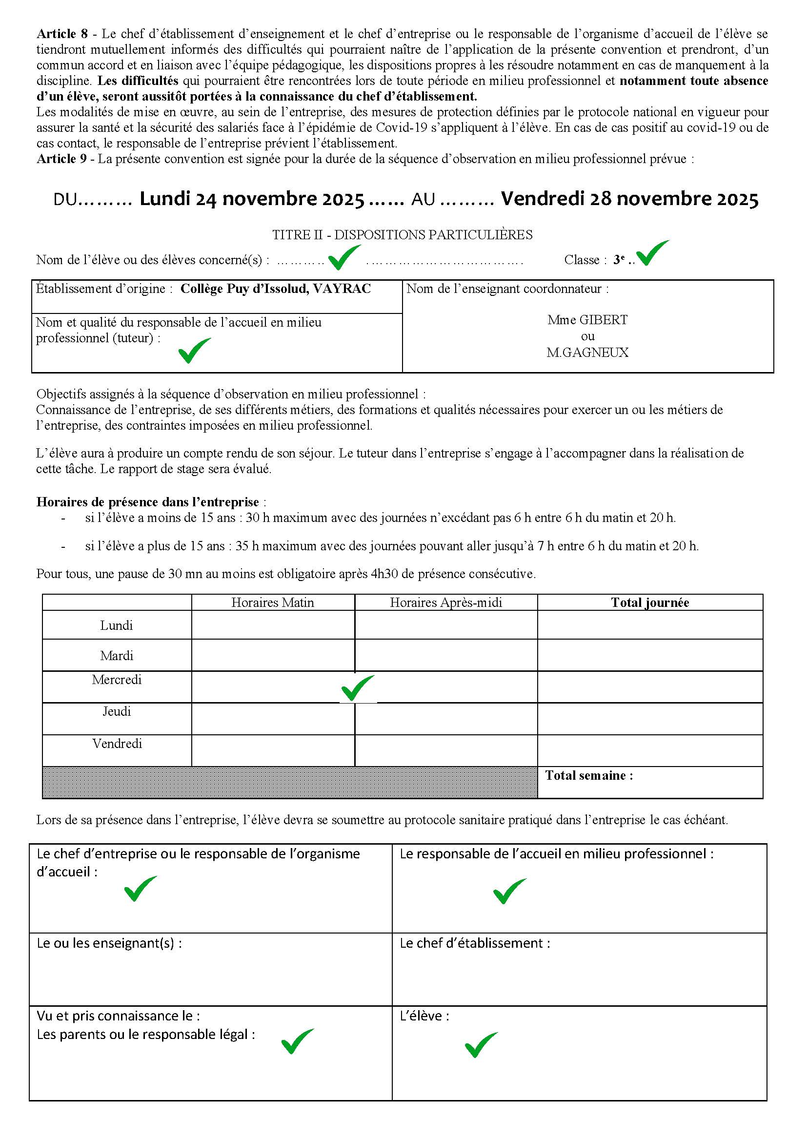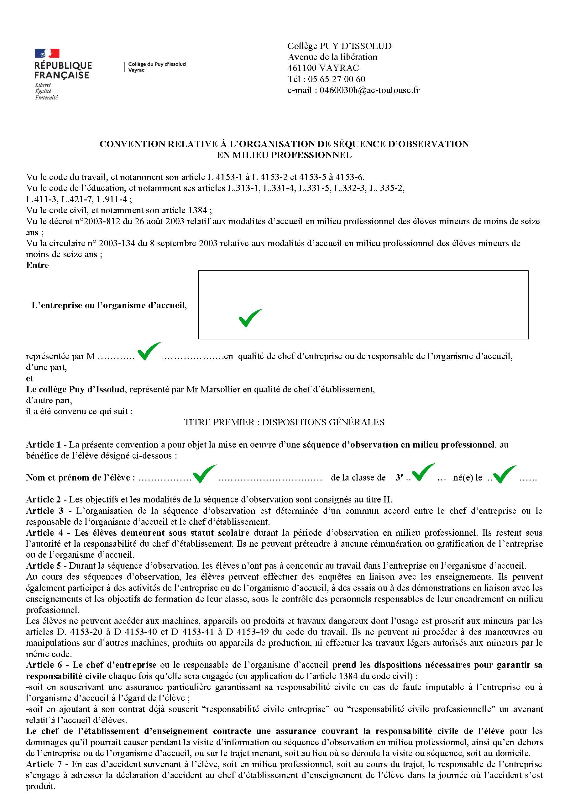 [Certaines entreprises ou structures habituées à recevoir des collégiens ont leur propre convention de stage, il faut l'apporter au collège : ex AIRBUS, Armée, ...] |